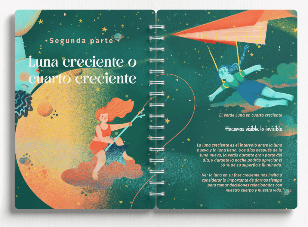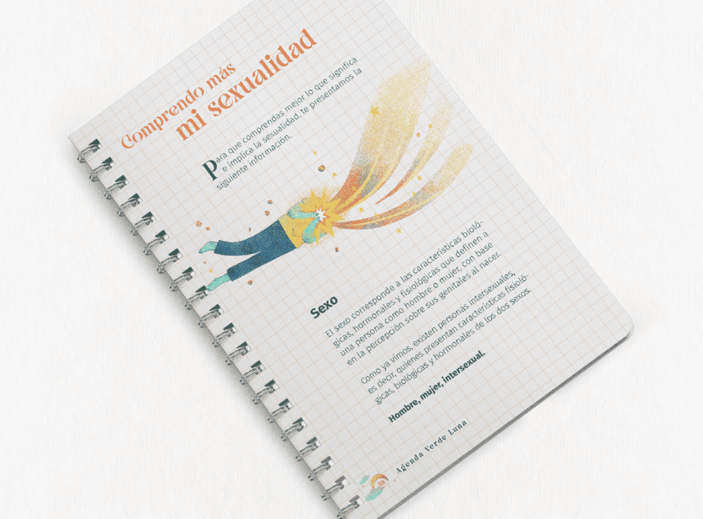 La agenda pedagógica, está inspirada en conceptos astronómicas y utiliza la metáfora de la Luna, para reflejar su influencia en nuestros cuerpos y la naturaleza. Los personajes, que incluyen niñas, adolescentes, mujeres, personas no binarias y trans, viajan por el espacio y aprenden sobre las diversas corporalidades, la menstruación, la sexualidad el cuidado y el placer, el amor romántico, la Interrupción Voluntaria del Embarazo, los feminismos, entre otros temas. El objetivo de la agenda es que cada día más personas desde la infancia y la adolescencia cuenten con información veraz para la garantía de sus derechos sexuales y reproductivos.